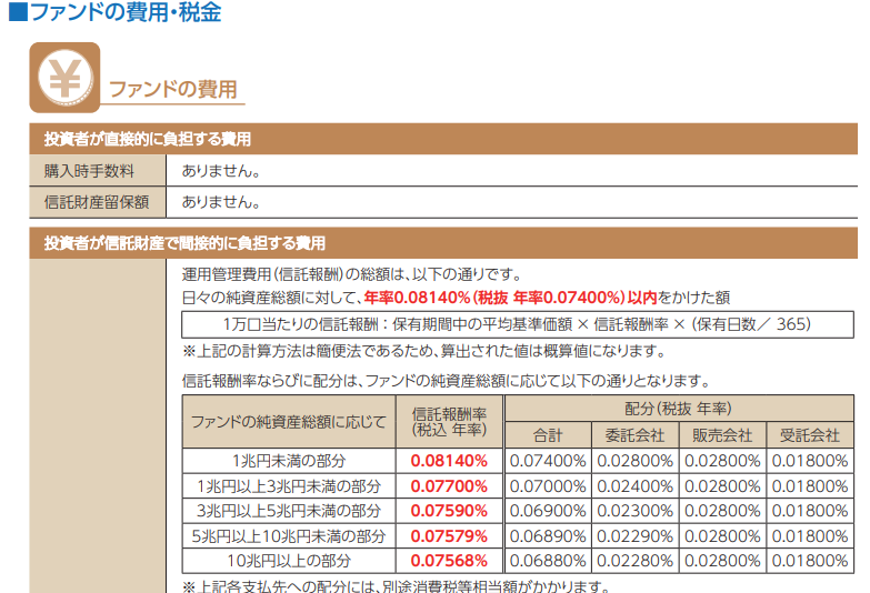そして少し下に目をやると信託報酬は、年率0.08140%(税抜 年率0.07400%)以内 と赤字で書かれています。
