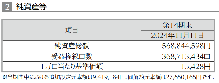 実際にこの投資信託の純資産総額を運用報告書で確認すると約5.68億円、受益権総口数は約3.68億口となっています。(2024年11月11日 )