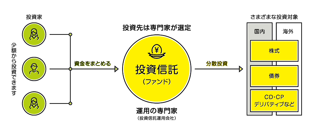 投資信託は文字通り投資を信じて託す商品であり、投資家から集めたお金を運用会社がまとめて株式や債券、不動産などに投資するという構造です。